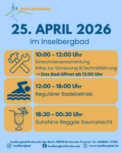 im Zeitraum vom 27.07.2026 bis 30.10.2026 führen wir eine energetische Sanierung im Inselbergbad durch. In dieser Zeit wird die Technik vollständig erneuert, um das Bad künftig noch nachhaltiger und energieeffizienter betreiben zu können.